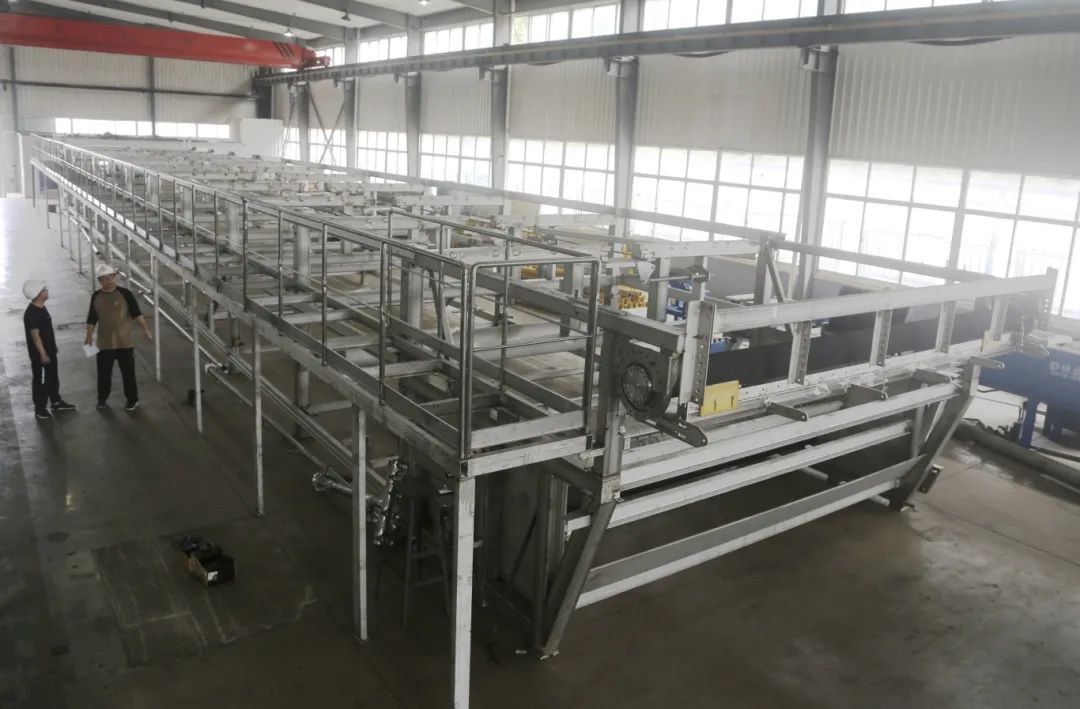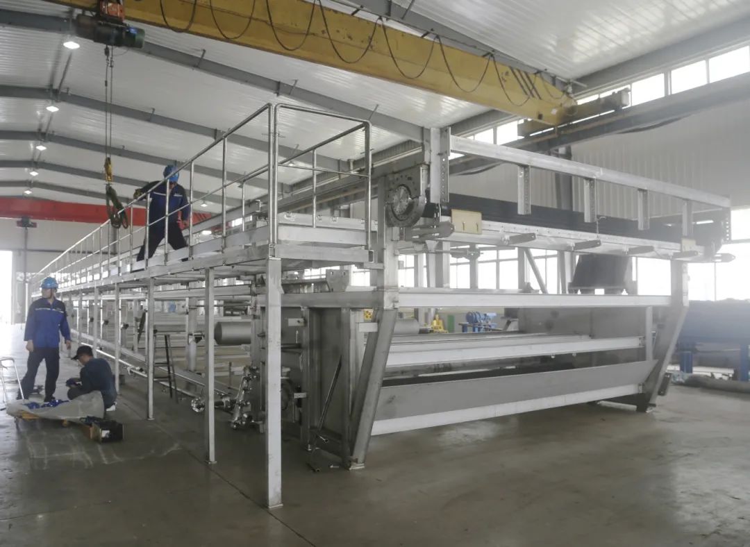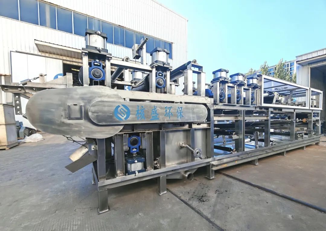 本合同设备(橡胶带式真空过滤机)用于塞尔维亚半水二水湿法磷酸项目半水磷酸反应料浆的过滤,项目地点位于塞尔维亚。车间积极响应,迅速行动,全体员工凝心聚力,团结一致,以饱满的热情投身到工作之中,迅速掀起生产大干的热潮。与此同时,为了适应市场,实现设备高效、低碳、节能目标,由核盛团队全新自主研发的——带式真空加压深度脱水一体机,目前已生产组装完毕,投入试验状态。 该设备采用前段真空负压预脱水、中段履带保压式正压进一步脱水、后段使用橡胶复合真空辊剪切力的对辊碾压进行深度脱水,可最大限度去除水份。该设备自动化程度高,可实现全自动运行,能完成连续喂料、过滤、洗涤、压榨、滤布再生等功能,维护方便、生产效率、滤饼含水率极低,可解决很多行业在使用固液分离设备上的痛点,为客户创造价值!相信该新产品一旦投放到市场,将会成为核盛新的经济增长点。